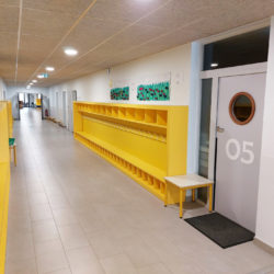 Le projet propose une architecture contemporaine avec un ensemble de 3 volumes continus en toiture terrasse. Le volume central est marqué par un enduit matricé vert en surélévation. Les façades sont revêtues de panneaux en bois de différentes couleurs et de largeurs aléatoires pour apporter de la verticalité à l’ensemble.